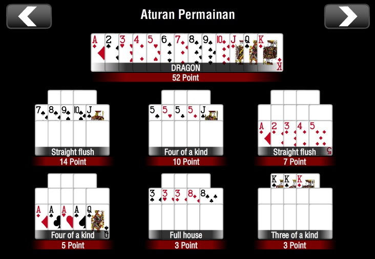 - FOUR OF KIND di susunan tengah akan mendapatkan 10 point.